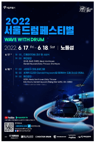 국내 최대 드럼 경연대회로, 청소년, 일반, 퍼커션 부문으로 나뉘어 진행됩니다. 예선은 3월 17일부터 4월 11일까지 영상 제출로 진행되며, 본선은 4월 26일 노들섬 라이브하우스에서 개최됩니다. 최종 수상자는 5월 10일 개막식에서 발표됩니다.